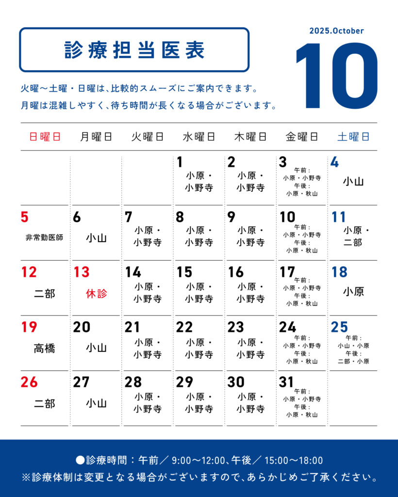 ●休診日:祝日・その他 ●診療時間:9:00〜12:00、15:00〜18:00