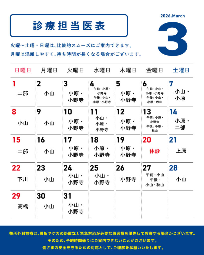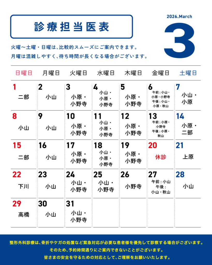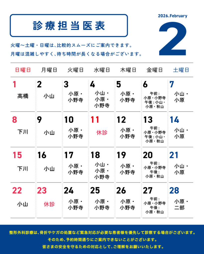 当院では混雑緩和を目的にインターネット予約もしくはLINE予約を行っております。日曜日は診察のみを実施しており、リハビリは行っておりませんので何卒ご了承いただきますようお願い申し上げます。