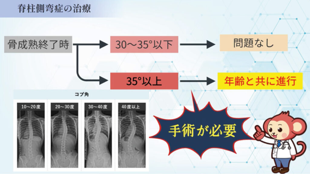 - 成長が終わった時点で30~35度以下なら大きな問題は少ないですが、35度を超えると将来手術が必要になる可能性があります