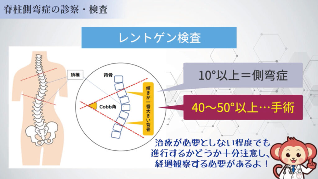 「レントゲン検査」側弯症を正確に診断するためにはレントゲン検査が必要です。側弯症の弯曲の大きさは、上下で最も傾いている椎骨同士のなす角度で判断します。この角度が10°以上であると側弯症と診断されます。40〜50°以上の場合は手術が検討されます。レントゲン検査の結果で機能性側弯や治療を必要としない程度の構築性側弯症と診断されても、それが進行するかどうか十分注意し、経過観察する必要があります。