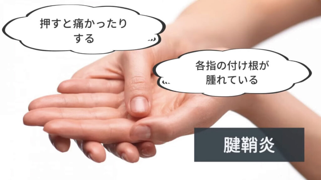 先ほどご説明した通り、指の付け根にある腱鞘と腱が使い過ぎなどで炎症を起こすと、いわゆる腱鞘炎になります。その腱鞘炎の状態では腱がスムーズに動くことができなくなり、痛み・腫れ・熱っぽさを感じるようになります。 特に朝に症状が強くなりやすく、逆に日中に指を使っていると症状が軽くなることも少なくありません。