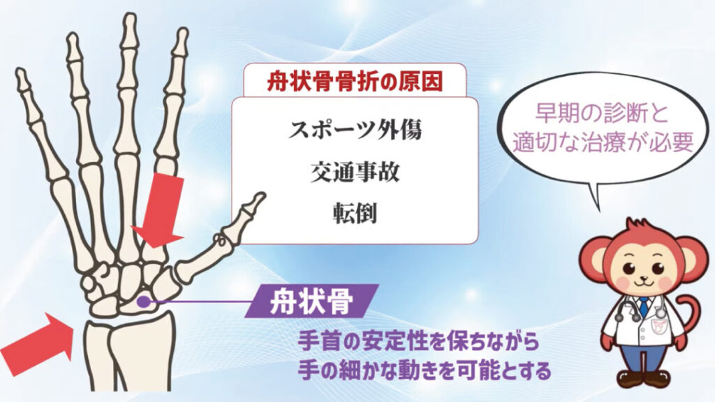 舟状骨は、手首にある8つの小さい骨のひとつで、特に親指側に位置します。手首の安定性を保ちながら、細かな手の動きを助ける重要な骨です。転倒時に手をついたり、スポーツや交通事故で強い衝撃が加わったときに骨折することが多く、手首の骨折の中でも頻度が高い代表的な骨折です。