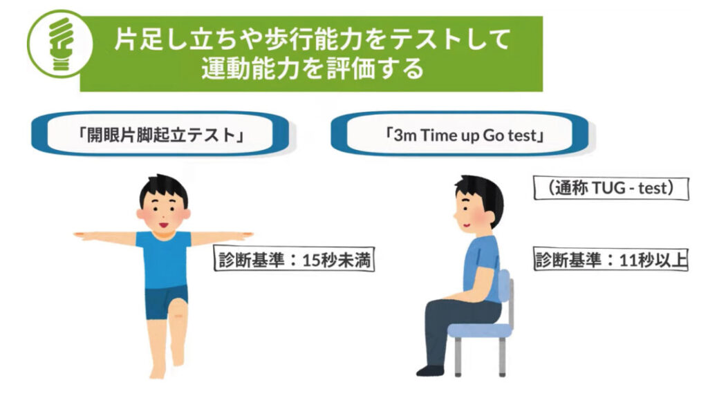 以上、運動器不安定症の診断では、運動器の能力低下に起因する11項目の疾患の有無と実際の運動能力のテストの2つを確認することで判断されます。