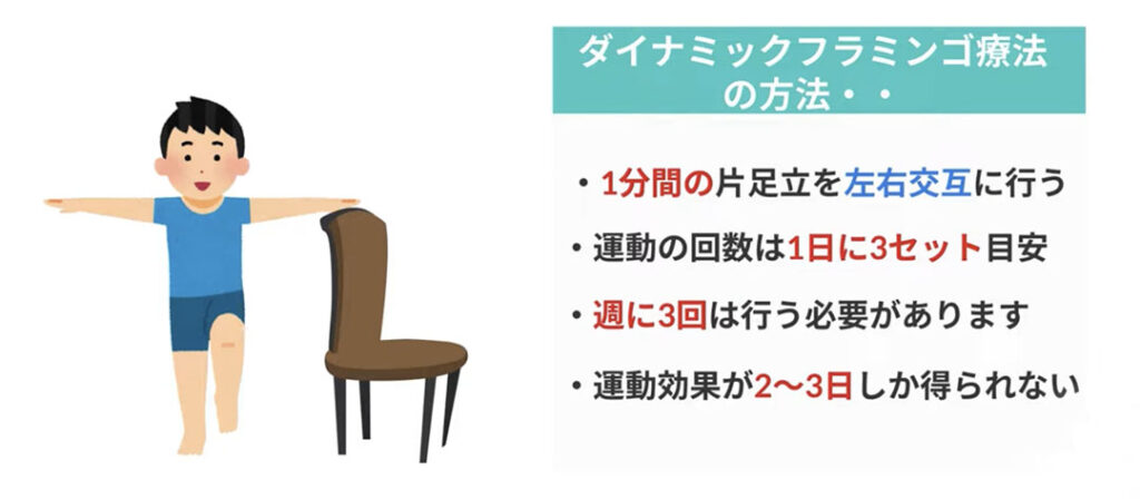 具体的なダイナミックフラミンゴ療法の方法は、1分間の片足立ちを左右交互に行うだけです。運動の回数は1日に3セットで目安であり、これを週に3回は行う必要があります。その理由は、運動効果が2〜3日しか得られないということが言われているからです。