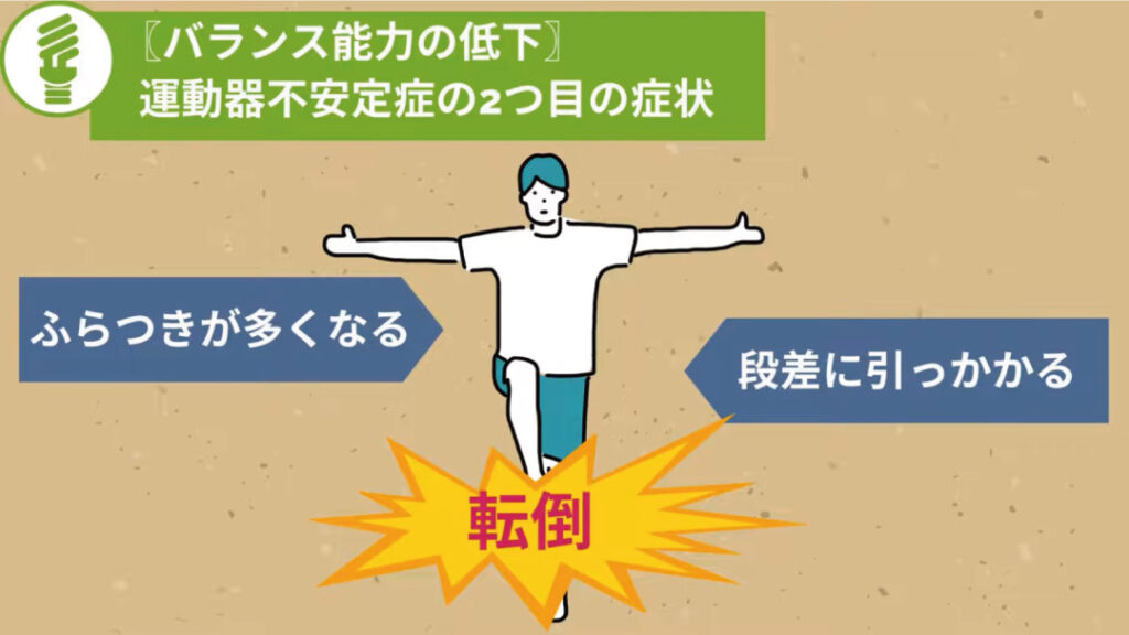 運動器不安定症の2つ目の症状には、バランス能力の低下があります。運動器不安定症でいうバランス能力とは、主に片足立ちを維持できる時間や能力を意味しています。片足立ちのバランス能力が失われると、日常生活では歩く際にふらつきが多くなります。また、片足立ち自体の動きができない場合には、小さな段差や階段などで足を引っ掛けてしまい転倒するといったことも見られるようになります。高齢者の場合、転倒は骨折や外傷などのケガにつながるため、特にバランス能力は低下を予防したい能力の1つになります。